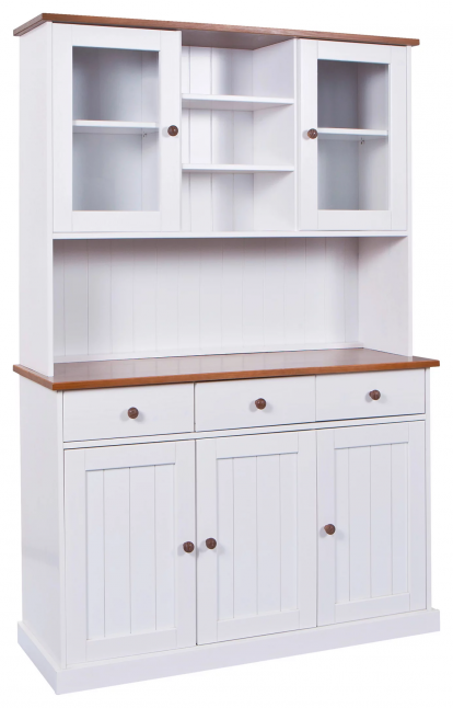 Vrchní část má krásně prosklená dvířka i otevřené přihrádky vhodné k vystavení nádobí, dole najdete dva menší šuplíky na drobnosti. 26 290Kč, foto: Nabytekmirek