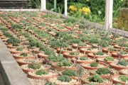 Altán lemují koryta a plochy se spoustou květináčků s lomikameny. Za ním vyjdeme po šikmé cestičce do nejvzdálenější části zahrady, na rovinku na vršku valu, oddělujícího pozemek od okolní přírody. Tady je sbírková část plná čarověníků a dalších dřevin.