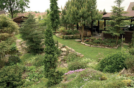 „Ze začátku jsem mohl promýšlet dispozice zahrady tak, aby vyznívala esteticky,“ vzpomíná pan doktor. „Dnes, když už je v podstatě zralá, se mi už nové věci přisazují hůře a dá to více přemýšlení. Dřeviny jsem tu začal pěstovat vlastně hlavně kvůli kamarádovi, který bydlí na horách a v zimě nemá kde brát rouby. Teď tu mám čtyři sta druhů čarověníků, smrků, a borovic jen o trochu méně. Prostě, čarověníky mají tu výhodu, že se ledaskam vejdou. Mně by asi více bavily javory a buky. Přece jen listnáče jsou každý jiný, zatímco u smrků existuje jen pár základních typů a pak už jde jenom o drobné variace na dané téma.“