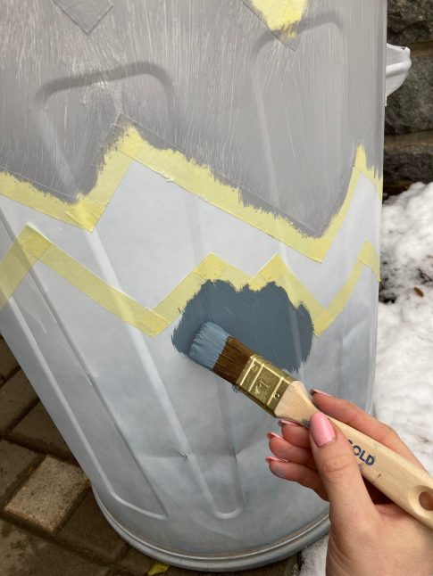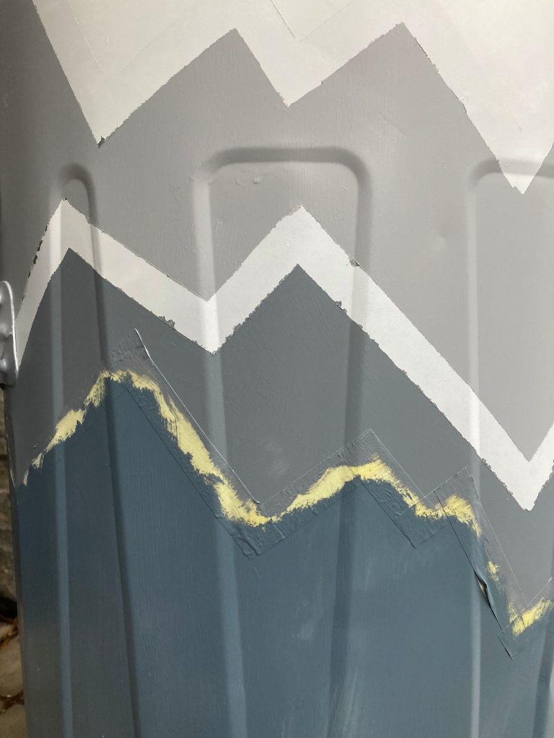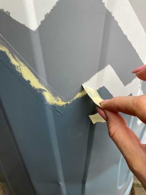 Maskovací páskou vyznačte motiv, který chcete namalovat – například vrcholky hor. Krycí barvu rozmíchejte a štětcem aplikujte ve 2 vrstvách s odstupem aspoň 4 hodiny