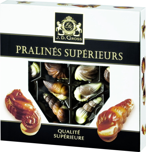 Mlsné jazýčky i oko potěší belgické pralinky ve tvaru mořských plodů Pralinés Supérieurs J.D. Gross, v kombinaci mléčné, hořké a bílé čokolády s lískooříškovou náplní. Balení 250 g koupíte za 59,90 Kč.
