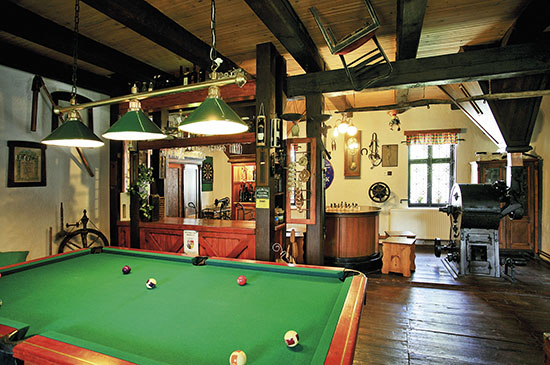 Z dalšího vybavení herny zaujme krásný kulečníkový stůl, který Jiří koupil od japonského velvyslance. Pro přátelská utkání tu slouží i šipky či fotbálek. Ve výzdobě místnosti se uplatnily nejrůznější předměty z minulých dob – kolovrátek, máselnice, cep, ze stropu zavěšená židle, staré váhy, mlynářské erby, staré fotografie. Jedna stěna je malou galerií – malíř sem zavěsil reprodukce obrazů z Národní galerie v Praze, jejichž povrch speciálně upravil silikonem, takže připomínají skutečné oleje na plátně. Z herny je vstup na dřevěnou pavlač, z níž se otevírá pěkný výhled do přírody.