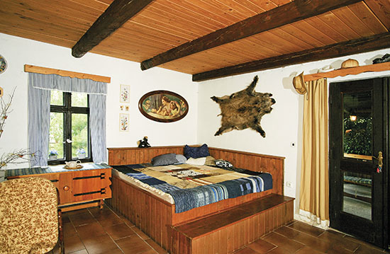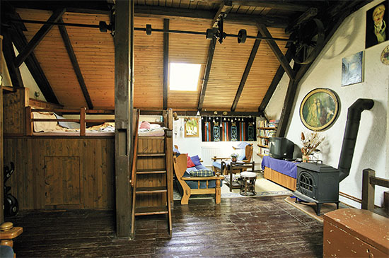 Pocit stísněnosti určitě nikdo mít nebude, mlýn nabízí obytnou plochu 400 m2. Na tři velká spací pódia – v ložnici, kuchyni a krbovém pokoji – se vejdou určitě víc než jen dva nocležníci. A v dětském pokoji je přichystáno kromě dvou postelí i další spaní v „komůrkách“ pod šikmou střechou.