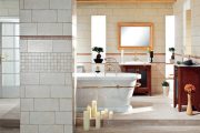 Při obkládání větších ploch nepotřebujeme skutečnou mozaiku. Stejného efektu dosáhneme i s obkládačkami, jejichž povrch je členěn jen mělkými prořezovými drážkami, ale vyvolává tak dojem drobné mozaiky.