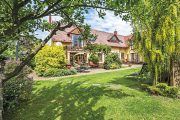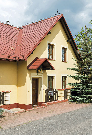 Dům s teple žlutou omítkou stojí na kraji malé vesnice. Vede kolem něj ze dvou stran silnička, ale situování stavení a zeleň zaručují obyvatelům klid a soukromí. Přízemní dům s obytným podkrovím se na první pohled nezdá tak velký, ale “klame tělem”. Má půdorys nepravidelného T, takže ze žádného místa ho nevidíte celý. Díky členitosti domu je členitá i zahrada kolem něj, o čemž se hned přesvědčujeme.