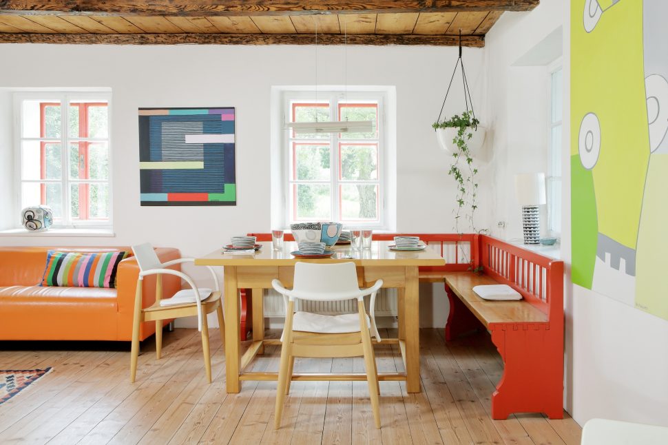 Barevné akcenty v interiéru tvoří především vlastní tvorba Iky – užitková keramika a obrazy. Vesele barevné abstraktní obrazy a keramické hrnečky, konvice, talíře, džbány a podstavce lamp nás ale provázejí po celém domě, i v galerii „napoli“ a v keramické dílně.