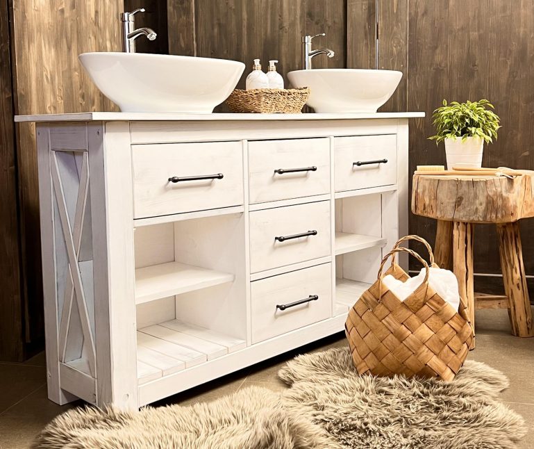 Skříňka ve venkovském stylu je dostatečně široká pro dvě umyvadla. 32 000 Kč (Foto: Fler, Bella Woods)