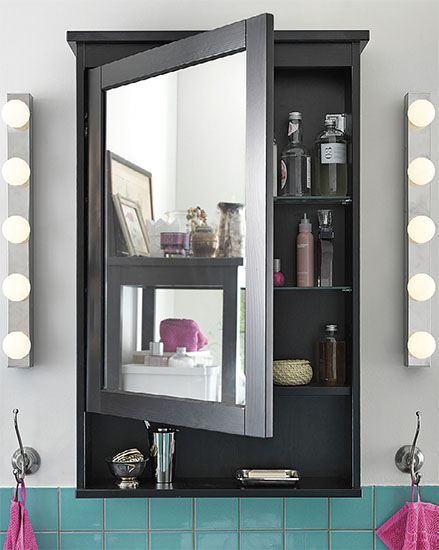 Kosmetické potřeby je nejlepší vyrovnat přehledně do jedné řady. Rychlým pohledem tak snadno zjistíme, co se kde nachází. Vedle mělkých doplňkových skříněk je pro kosmetiku praktická tzv. galerka, která plní funkci jak zrcadla, tak úložného prostoru a věšíme ji nad umyvadlo. Její vnitřní prostor může mít i osvětlení a ukrývat elektrickou zásuvku.