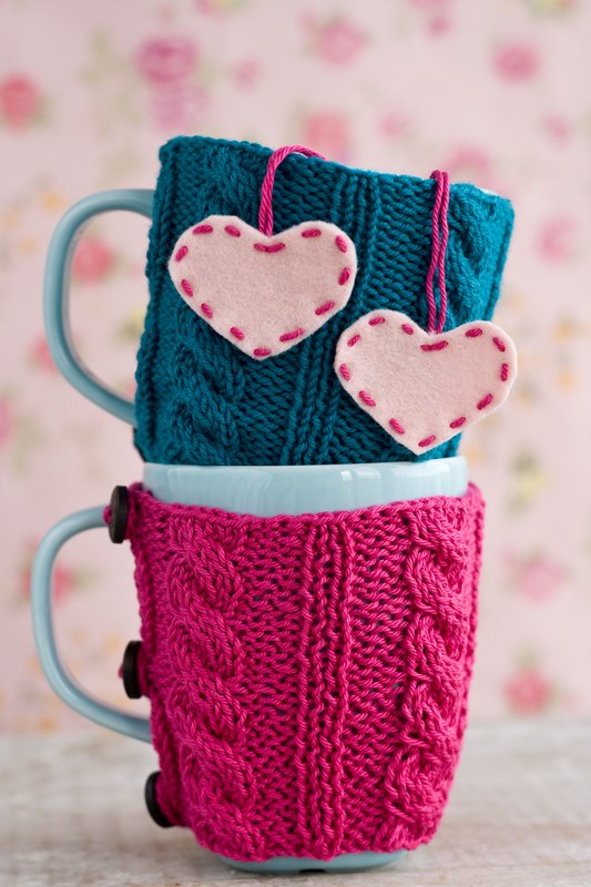 Kdo už někdy měl pletací jehlice v ruce, s prací si snadno poradí. Stačí zbytky pestrých vln, jehlice a jeden až tři knoflíky. Pleteme rovný pruh, hladký nebo se vzorem, jedno- či vícebarevný. Jeho šířka se rovná obvodu hrnku v nejužším místě, výška je o něco menší než výška hrnečku. Jen u hrnku dole výrazně užšího budeme přidávat oka. Zapínání řešíme podle umístění ouška – pod uchem může být úplet sešitý nebo se zapíná na knoflík, další knoflík je uprostřed ucha. Poslední knoflík může být nad ouškem. Pro knoflíky vypleteme dírky nebo vytvoříme poutka.