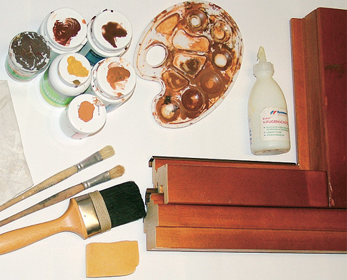 Na vady, způsobené „V“ spojem, používáme polyesterový tmel na dřevo (Polytmel Dřevo od BKP), který lze probarvovat olejovými barvami (nejlépe malířskými v tubách).