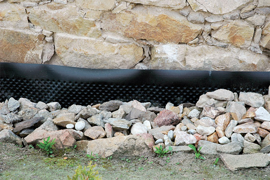 V praxi to vypadá tak, že kolem postiženého objektu se vykope příkop o šířce lopaty, který bude spádován a případně doplněn odtokem. Drenážní výkop se vyplní velkými kameny, na nichž je uložena vrstva menších, horních asi pět centimetrů tvoří vrstva hlíny, která se nakonec zatravní. Aby hlína nepropadala mezi kameny, klade se pod ni geotextilie. V současné době se nejvíce používají perforované drenážní roury uložené na dně výkopu, které jsou pak zasypány hrubým štěrkem a zahrnuty zeminou. Výkop by měl být od základů vzdálen aspoň 80 cm.