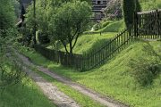 Vrátíte-li se do dlážděného úvozu a budete pokračovat vzhůru, objevíte centrum vsi s dřevěnou zvoničkou a křížkem pod dvěma rozložitými kaštany a s devíti roubenými chalupami. Zadní štít mohutného patrového domu čp. 5 s jednoduchou nezdobenou lomenicí budete obdivovat hned nad vysokým tarasem u příjezdu. A za cestičkou vpravo, z níž na vás vykoukne přízemní roubenka čp. 6 a velká patrová chalupa čp. 7, obě plně zdobené, objevíte za košatou olší pilířovou bránu s rovným překladem, uzavírající dvůr nejhodnotnější památky lidové architektury ve vsi. Jde o usedlost čp. 12, jejíž přízemí i patro jsou roubené a zadní trakt, bývalé chlévy, přezděné. Nad vstupem je v patře zapuštěná pavláčka,