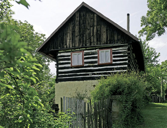 Přízemní dům čp. 22 s bíle natřenou zdobenou lomenicí patří k nejmladší generaci roubených staveb na návsi
