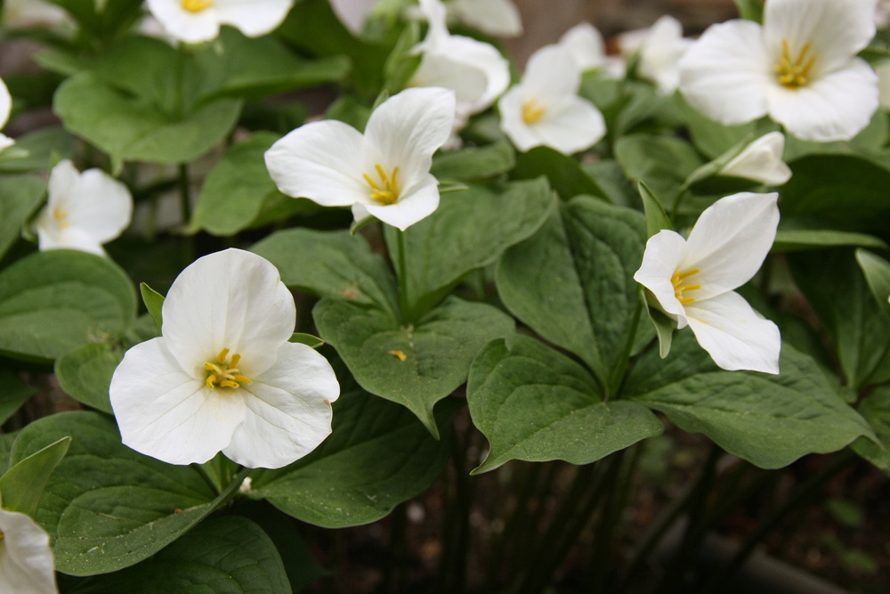 První skalky vznikly před domem. Ve stínu lísek tu rostou zejména trojčety, naproti pak pod stromy ještě stále kvetou prvosenky a řebčíky. Podél boku domu se vedle cestičky vejde jen pár velkokvětých lewisií Tweedyových a miniaturních zvonečků vřesovcovitého keříku kasiope.