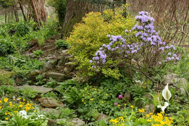 Pod skalní partií zahrady je ráj pěnišníků a azalek. Hladina spodní vody tu je těsně pod povrchem. Proto se tu daří vlhkomilným rostlinám. Majitel sem vysadil plnokvěté blatouchy, česneky medvědí, americké i kamčatské kapsovce nebo kostivaly s panašovanými listy. Trsy bledulí letních už tu rostou skoro jako plevel.