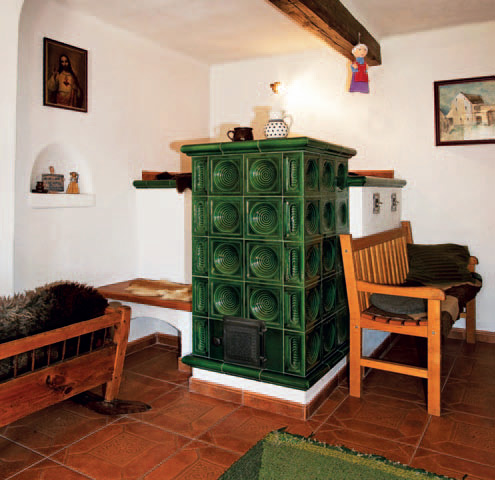 „Tady se vařívalo celé léto, v sednici by bylo moc teplo. Dodnes vidím dědu, jak seděl na malé stoličce a přikládal chrastí, aby se maso dobře peklo. Vařila se denně tři teplá jídla. V zimě bylo zase příjemné roztopit kachlová kamna. Vždycky byla zelená. Ale jak se v nich po té dlouhé době zatopilo, spadla z kachlů glazura. Koupila jsem nové, ale původní dekor jsem už bohužel nesehnala.“