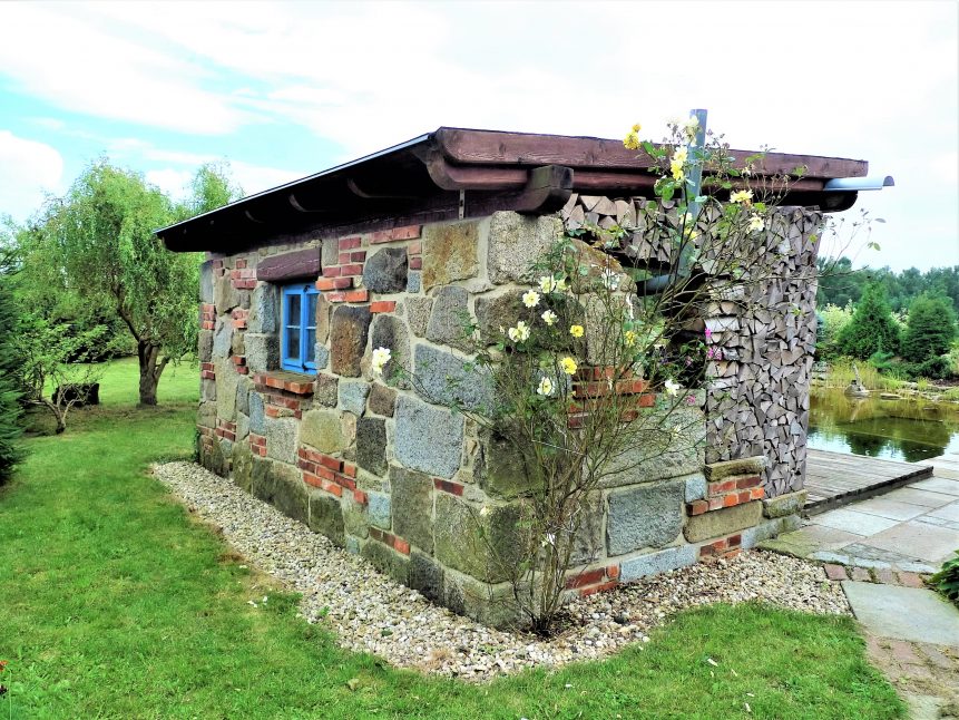 Domek je půvabný právě díky kombinaci barevně různorodých kamenů, cihel a dřeva, svým dílem přispívá i blankyt okénka. Stěny zkrášluje z jedné strany růžička, z druhé se pne po konstrukci břečťan. A uvnitř je gril udělaný ze starého bojleru. Zapomněla jsem se tvůrce zeptat, na kolik to všechno přišlo, ale můžeme si asi odpovědět sami…