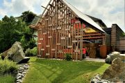 Vzdušná je tato stavbička zejména proto, že jedna celá stěna je bez pevné výplně, krytá pro případ nepohody jen plachtou, jakou se „obléká“ lešení při opravě staveb. Působí vzdušně i proto, že ve dvou dalších stěnách jsou veliká okna, jaká bývala v továrnách. „Při demolici jedné fabriky v okolí jsme je právě získali,“ říká majitel. „Samozřejmě jsme je pak museli opískovat, nastříkat a nově natřít. A tabulky nechat nově zasklít. Naše útulna s nízkým vaznicovým stropem má díky těm oknům úžasnou atmosféru a světlo.“