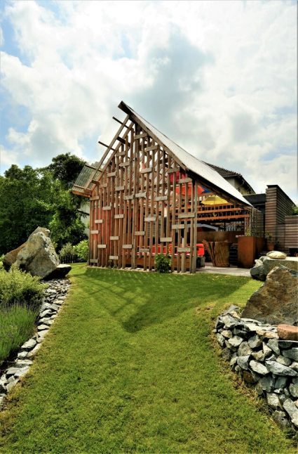 Tenhle vzdušný altánek s venkovní kuchyní si na zahradě postavil architekt Jan Topinka. „Na štíty jsem použil 110 mm široká a 24 mm tlustá modřínová prkna, která není nutné ničím natírat. Umístil jsem na ně kolmo prkénka, která konstrukci spojují a dodávají jí také určitou estetiku. Štíty jsou zároveň konstrukční, jsou propojeny vaznými trámy a nesou sedlovou střechu,“ vysvětluje.