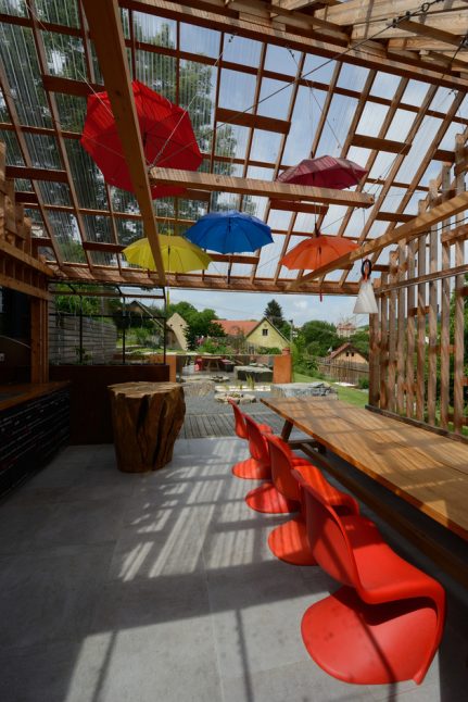 Mezi trámy je řídký rastr z prken, přes který jsou položeny polykarbonátové desky. Spod nimi jsou slunečníky, nastavené tak, aby stolovníky po celý den chránily před sluncem. Jsou přivázány ke trámu, který je na konstrukci upevněn ocelovými lanky, není tedy problém je na zimu sundat, umýt a složit. Deštníky doplňují kompozici, v níž vedle dřevěných povrchů zaujme hlavně jasně červená, dalšími zářivými barvami.