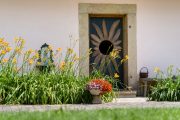 Při vstupu do chalupy vítá příchozí dřevěná plastika velkého slunce, foto: Tomáš Dittrich