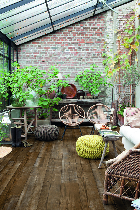 Výklenek na zápraží domu majitelé ochránili skleněnou střechou a stěnou a položili tu podlahu v dekoru širokých prken. NA verandě se daří zeleni a dobře se tu odpočívá. (Quick Step)