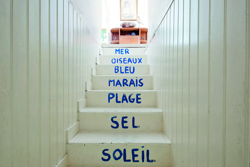 Schody do patra působí jako neobvyklá čítanka. Modře namalovaná slova „slunce“, „písek“, „ptáci“, „mokřiny“, „moře“ označují prostou každodenní radost. Fotky dětí, které v průběhu let pořizoval jejich otec, mile připomínají, jak i tady čas letí.