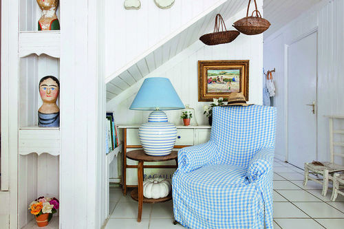 „Způsob, jakým dekoruji, je velmi instinktivní,“ svěřuje se nám paní domu. „Chtěla jsem vřelé a žoviální prostředí. Dekorací se často stává náhodně nalezený předmět v galeriích a obchodech se starožitnostmi na ostrově. Takto jsme našli třeba parníkovou židli z rákosu, stará pádla, krásné malé kusy nábytku, pracovní stoly nebo dámské toaletní stolky. Hodně se mi líbí zarámované olejomalby s dětskými portréty, které svými barvami oživují stěny a jsou často v nějaké spojitosti s rodinou. Námořník na obrazu se podobá mému muži, malá holčička v bílém klobouku u moře zase dceři Marthe.“