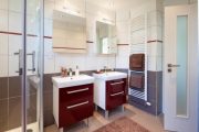 Nad každou skříňkou je zavěšena designová galerka – se zrcadlem a zabudovaným osvětlením, které je dalším zdrojem světla v koupelně. S červeným vysokým leskem skříněk je také provázán keramický obklad stěn – bílošedá kombinace je ozvláštněna jemným červeným proužkem.