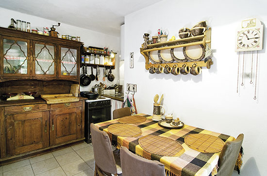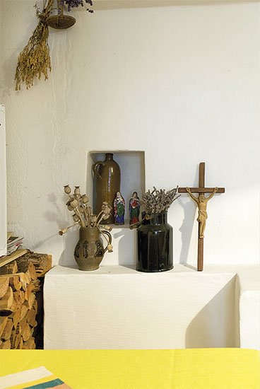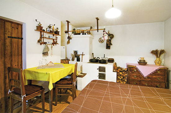Vlevo od vstupu je kuchyňka a vpravo obývací pokoj s jídelním stolem a letištěm. A hlavně jsou tu fešná, bíle omítnutá kamna. „Nechtěl jsem žádnou retropec z kachlů, sem se hodí bílá. Místní říkali, že právě taková kamna vpředu bývala,“ vysvětluje pan Václav, který nezapomněl ani na mělkou niku a stupínek na kobce, aby bylo kam dát nějakou tu ozdobu. „Moc jsem ani neštudoval, jak se taková kamna staví, jde spíš o moji fantazii. Hlavně jsem dbal na to, aby všechno proporčně sedělo. Vnější plášť je z normálních cihel, tahy samozřejmě ze šamotových.“