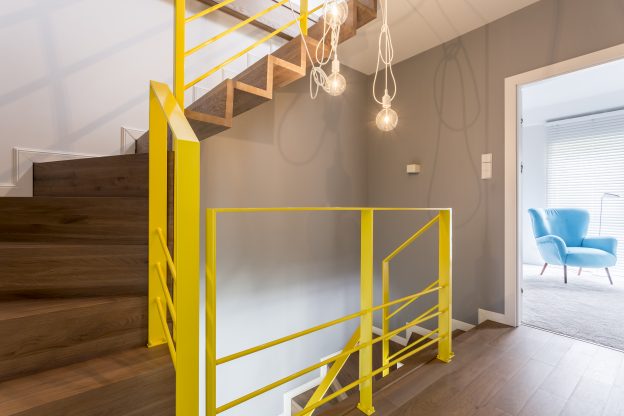 I se zábradlím si můžeme barevně pohrát. Může dostat stejný nátěr jako schody, ale může být také tím prvkem, který vnese do prostoru schodiště trochu vzruchu. Především zábradlí se svislými příčkami láká k různobarevným fantaziím. Nebo alespoň odlišíme barevnost madla a zbytku zábradlí.