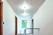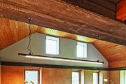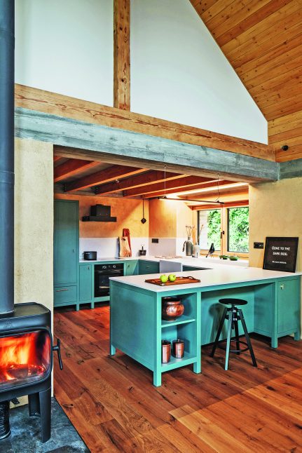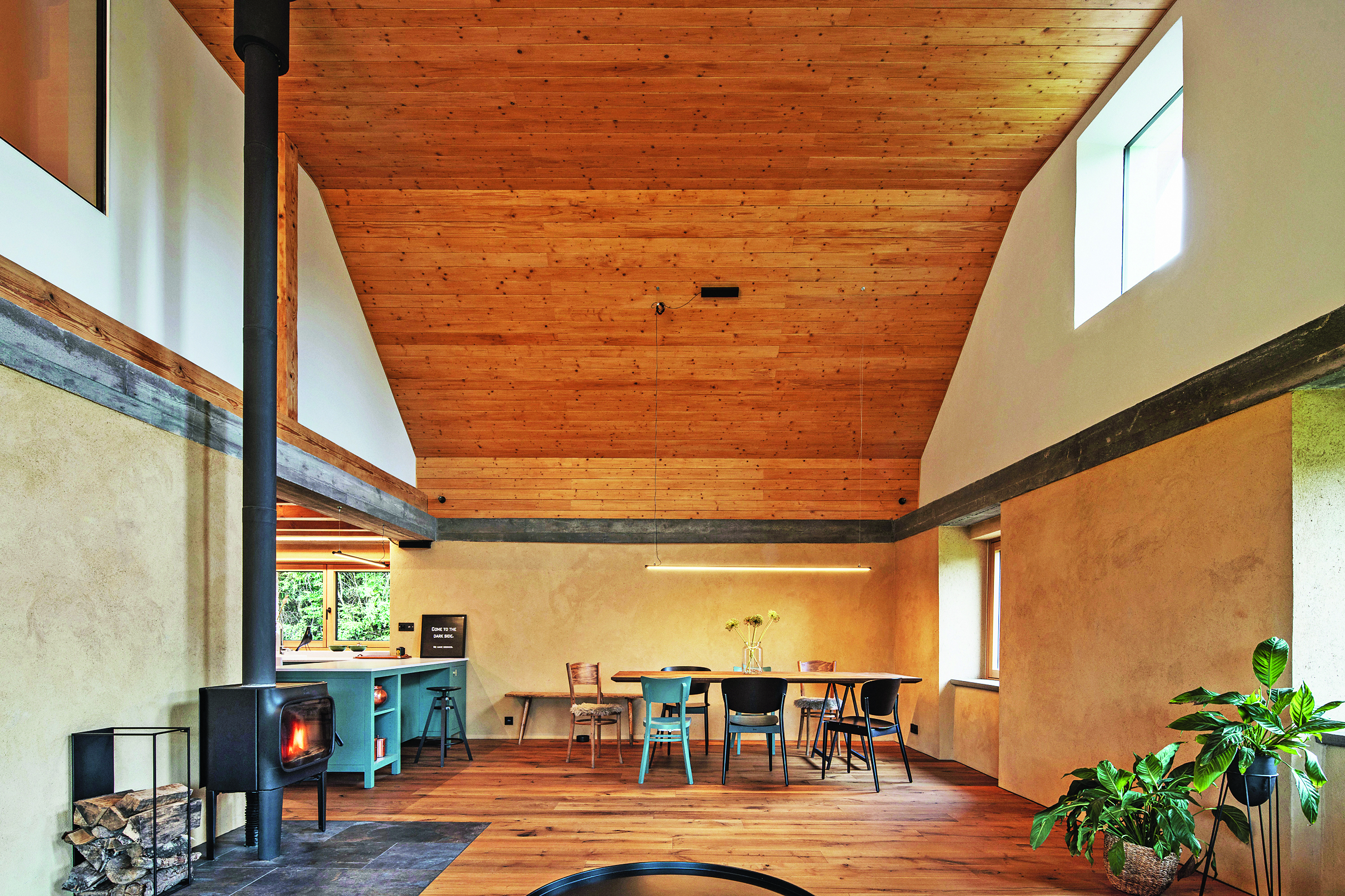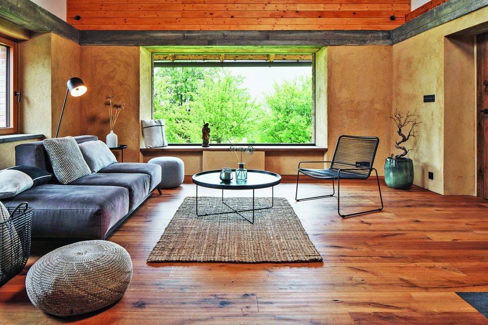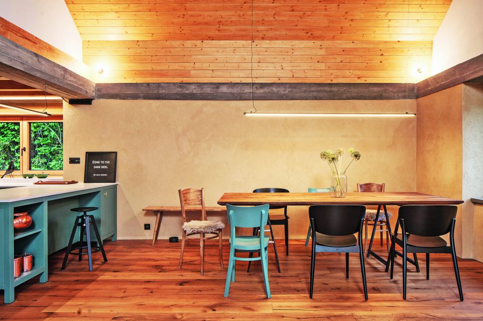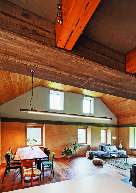 V místě společenského prostoru architekti odstranili původní zchátralý trámový strop. Uvnitř si tak obyvatelé užívají otevřený velkorysý prostor. Tím nejdůležitějším elementem je ale velkoformátové bezrámové okno, ze kterého je vidět to nejkrásnější – šumavská krajina. Tady, ve velkém obývacím pokoji, je většina nábytku vyrobena na míru od místního truhláře Martina Kučery. Výrazným interiérovým prvkem nejen v této místnosti je písková omítka dělaná ručně místními řemeslníky. Hlavní ideou barevného ladění domu bylo nechat vyznít jednotlivé materiály a jejich syrovost – kamenné stupně, pískové omítky, železobetonový věnec, masivní dřevo i ocelové zábradlí. Celá kompozice byla pak zjemněna barevným akcentem tyrkysové kuchyně a zárubní mezi chodbou a kuchyňským koutem. Jako zdroj tepla tohoto velkého prostoru, ale i zbytku domu je využíváno tepelné čerpadlo typu vzduch-voda. V přízemí slouží teplovodní podlahové vytápění, v podkroví radiátory. Přitápí se krbovými kamny Jotul.