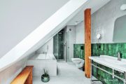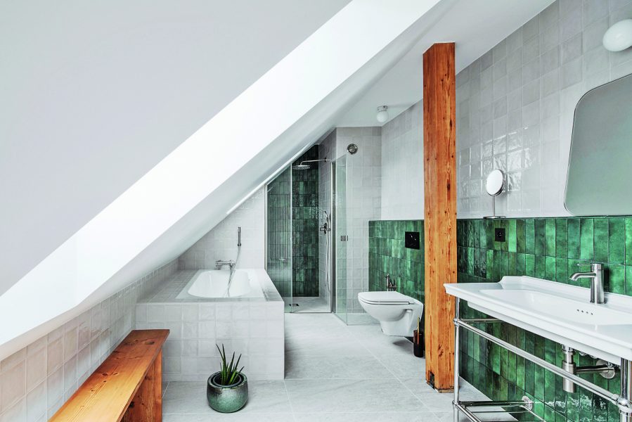 Koupelna v patře se šikmým stropem využívá chytře prostor, foto: Petr Polák Studio