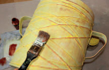 - Natřeme pomocí širšího štětce žlutou barvou, necháme zaschnout a postup ještě dvakrát zopakujeme. Tím provázky k nádobám přilnou a zatvrdnou.