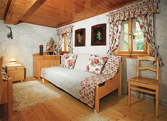 Obě místnosti jsou laděny do živých tónů. V přední ložnici hraje roli kanafasové povlečení, v zadní ložnici se uplatnil ve velké míře výraznější květovaný dekor v kombinaci s režnou látkou, které pocházejí z vrchlabské firmy By-tex paní Vlachové.