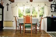 V chladném počasí přijdou ke slovu krbová kamna nebo přímotopy. Ty jsou i ve vedlejší kuchyni. „Dnes bych v přízemí určitě udělal podlahové topení,“ svěřuje se majitel. Také v pokoji jsou textilní doplňky laděny do zeleno-bílé barevnosti. Prozradíme, že kanafas nejen v této místnosti, ale v celé chalupě pochází z vlastní výroby pana Zítky.
