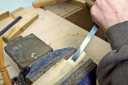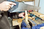 Označíme si délku čepu. Tuto linii pilkou slabě nařízneme- Pomocí dláta a kladiva dřevo kolem čepu odsekáme