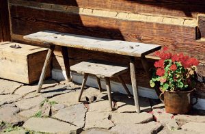 Prostá lavička se šikmými nohami se k venkovské chalupě hodí