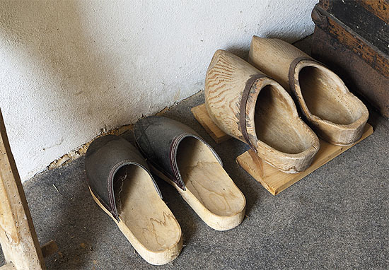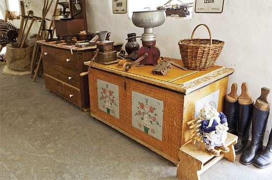 Průchod do navazující stáje skotu, který kdysi usnadňoval péči o dobytek, Hoškovi zazdili a celý ten krásný prostor s klenbami upravili jako muzeum jihočeské vesnice. Náš průvodce dovede zasvěceně pohovořit o každém kousku ve sbírce, kterou sám nashromáždil a upravil. Kovové nářadí nechal tak, jak bylo, ale dřevěné omyl a opatřil Červostopem. „Větší stroje jsme dali na dvůr. Když jsme rodový grunt koupili, byly na něm jen obrovské keře bezu a bodláky až do pasu. Museli jsme všechno vysekávat a postupně pálit,“ vzpomíná na krušné roky.