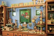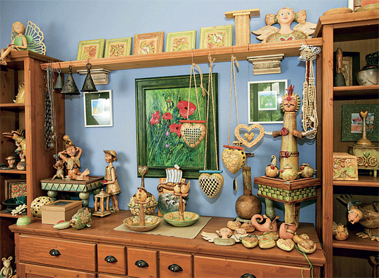 Hlavní slovo ale má v interiéru keramika a další výtvarná díla – jak vlastní, tak od jiných autorů. Na hlubokých parapetech oken vytvořila Věra malé keramické „galerie“. V jídelně nás upoutala čelní stěna s Věřinou keramikou. Oči každého přitáhne modrá nika s rozměrnou plastikou anděla, jejímž autorem je přítel Miloš Šedivý.