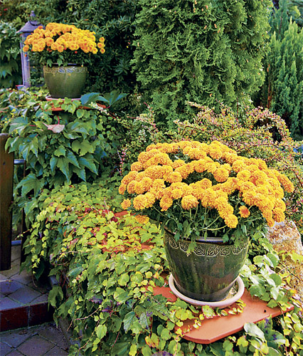 Na zdi před hlavním vchodem se pne psí víno, v zahradě se daří i kanadským borůvkám. Květin mnoho nenajdete – lilie, levandule, teď kvetou i chryzantémy v květináčích.“