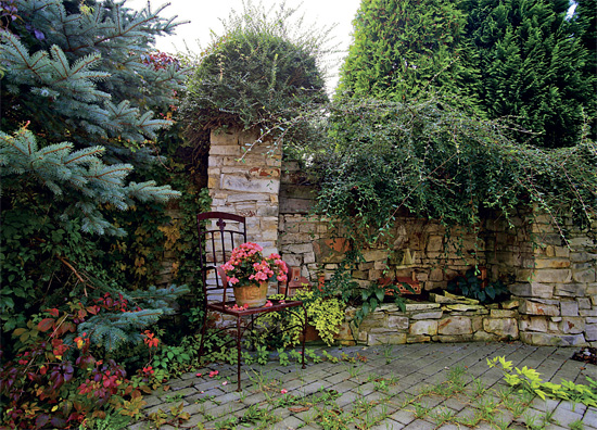 Podobných zákoutí se nachází na zahradě víc. Cestičky a schody se různě vinou mezi keři, stromy a živými ploty, stoupají do svahu až k terase se zahradním krbem a posezením. „Tahle horní část zahrady je hlavně dílem Petra a Pavlínky. Ještě tu plánují postavit pergolu.
