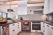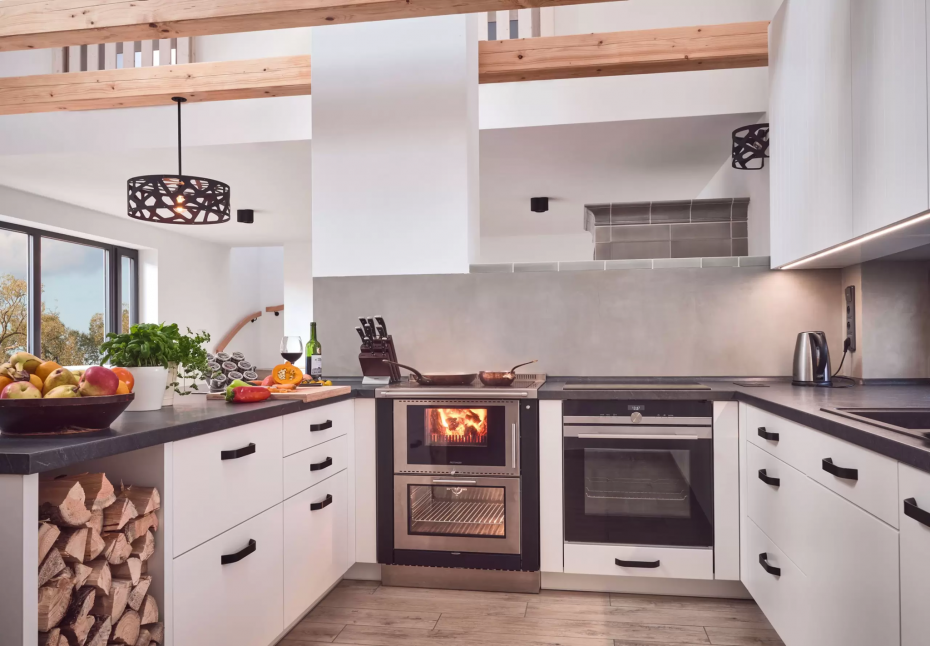 Kamna na dřevo Ökoalpin 70 BU XL v provedení nerez a černá lze zabudovat do kuchyňské linky, foto: pertinger