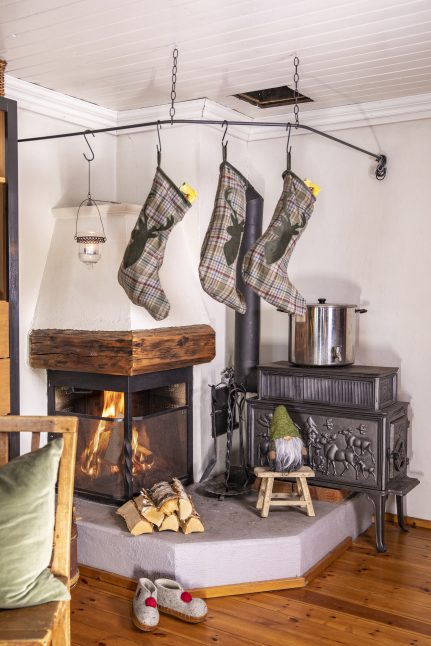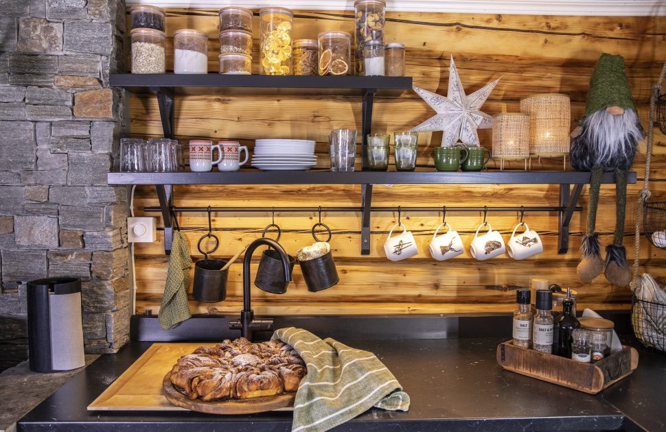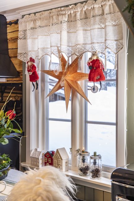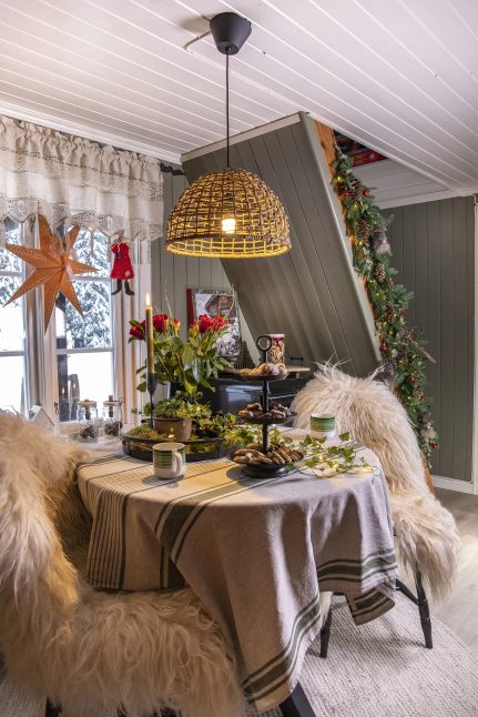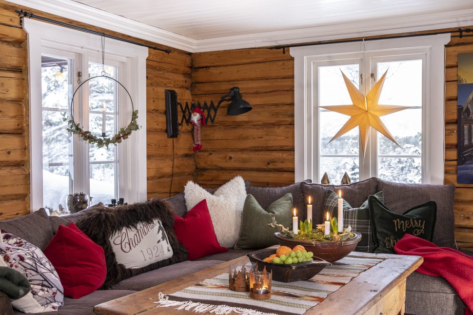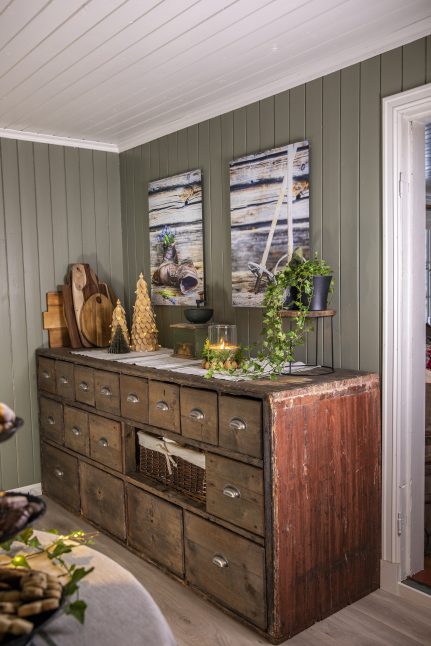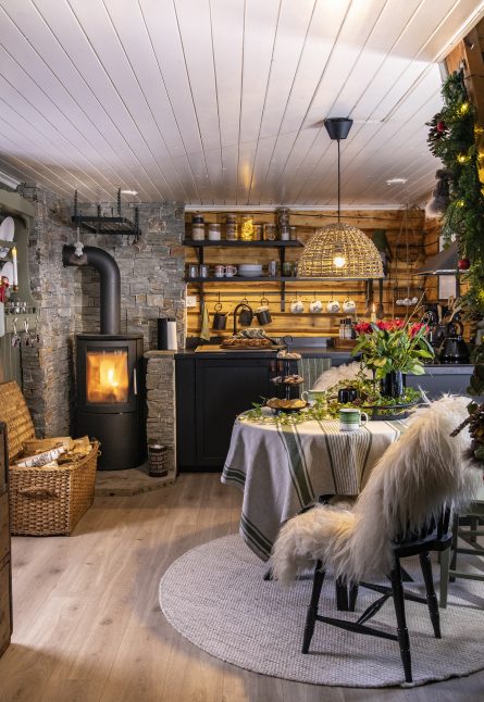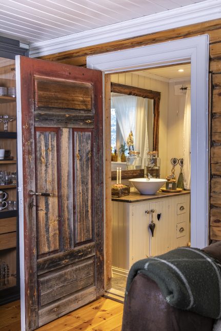 Úplně první věc, kterou udělali, když srub převzali, byla obnova krásných, ale zanedbaných dřevěných stěn. Byly natřeny farmářskou červenou barvou, což si vyžádalo mnoho hodin broušení a následného omítání. „S úhlovou bruskou to fungovalo docela dobře,“ hodnotí Øystein. Je truhlářem a Lene si opravdu cení toho, že je tak šikovný. „Přišla jsem se spoustou nápadů a plánů, které Øystein realizoval,“ oceňuje. Když později měnili kuchyňskou linku, podívali se za obložení a s nadšením vzali na vědomí, že i tam je pěkné dřevo. Chata je z velké části vybavena znovu použitým nábytkem. „Doma, na farmě, jsme měli veliké množství mobiliáře, který jsme sem přivezli,“ říká naše hostitelka. Hledala i ve starožitnictvích. „Miluji kouzlo starého nábytku, stopy používání a také duši těch věcí.“
