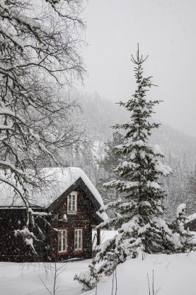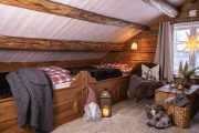Zhruba před 20 lety Lene, Øystein a jejich tři děti převzali chatu a zahájili renovaci. „Nějakou dobu jsme žili v docela jednoduchých podmínkách,“ říká Lene a předkládá důkaz: „Elektřina byla zavedená teprve vloni a do té doby jsme používali plyn a solární panel.“ Když se rodina srubu ujala, nebylo tady žádné podkroví a tak palandy pro nocležníky stály v rohu kuchyně. Své chataření Lene s Øysteinem začali tím, že hned odstartovali stavbu části pod střechou, která je nad kuchyní. V plánu bylo mít obytné podkroví i nad obývacím pokojem, ale to by ještě pár let trvalo. „Vestavěné postele pod šikmou střechou nahoře zorganizoval a vybudoval můj bratr,“ dodává Lene. „Zatím zůstávala lůžka rozebraná dlouhých deset let ve skladu, než jsme je přestěhovali do domu.“