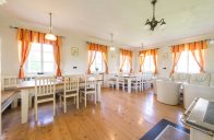 Celý zbytek domu je určen pro hosty. V čele výměnku je velká společenská místnost s kuchyňskou částí, kachlovými kamny, dvěma jídelními stoly a pohovkou s křesly. Stoly s lavicemi a židlemi a kuchyň na míru dodala firma Art-Style. Na podlaze je nové teraco a prkna, použitá z půdy. Na místě kozího chlívku a přípravny krmiva, později pokojíků, je ložnice, kuchyňka a koupelna s WC. Z chodby je vstup i na samostatné WC. „Pojďte se podívat do sklepa, po rekonstrukci v něm vznikla vinárnička,“ zve nás René.