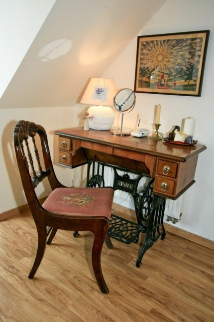 Krása a pevnost litinové podnože stolku od šlapacího šicího stroje inspiruje k využití. Po výměně desky je tu originální stůl!