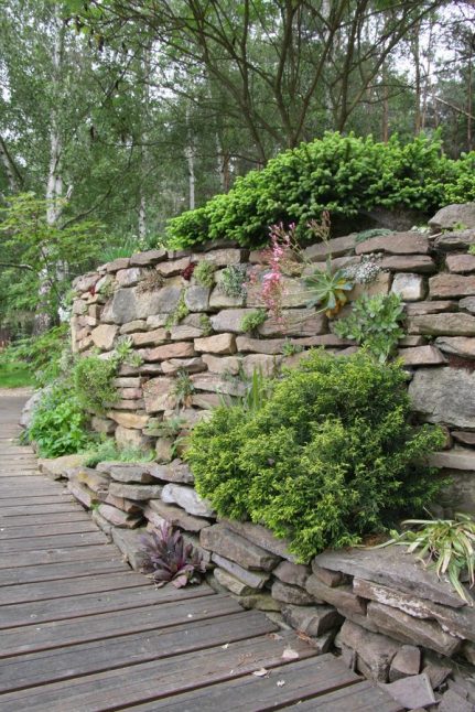 Pokud má zahrada několik teras, lze zídky využít nejen jako nosiče pro skalničky, rostoucí ze štěrbin mezi kameny, ale i jako základnu pro květináče, usazené na kamenné či dřevěné obrubě.