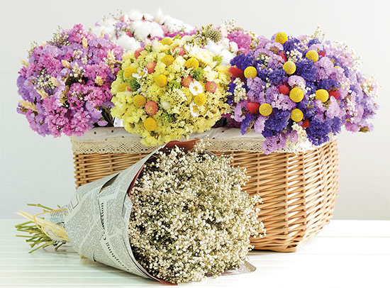Kolem chalupy najdeme spoustu květin a rostlin vhodných k usušení. Některé si můžeme i vypěstovat. Nejsnáze se suší pestrobarevné slaměnky, tedy smil, časovka a smilek, které v kytici ostatní květiny podrží a barevně ji osvěží. Dále jsou to růže, levandule, pivoňky a hortenzie, statice, šater, měsíčnice, limonka, světlice, laskavec, černucha, vousatec, mochyně, bělotrn, len, vřes, pelyněk, řebříček nebo vratič. Od vody si přineseme třeba rákos.
