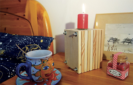 I malé zbytky prkének se ještě dají využít k výrobě různých dekoračních předmětů. My jsme z nich vytvořili svícen v podobě hranolu.